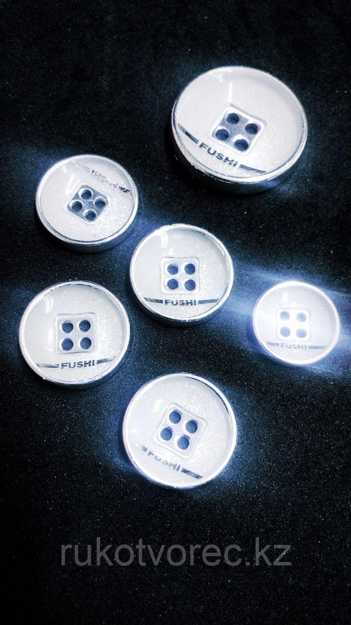Комплект пуговиц 3 разных размера светло-серые с серебристым обрамлением и надписью Fushi